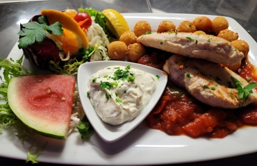 mit einer fruchtigen Curry-Creme, Salat, Tomaten, Zwiebeln und Käse