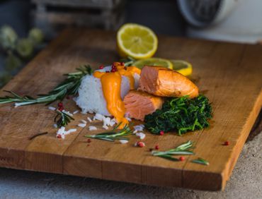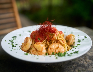 in Knoblauch Chili-Butter geschwenkte Spaghetti mit Cherrytomaten und gebratenen Riesengarnelen