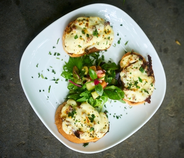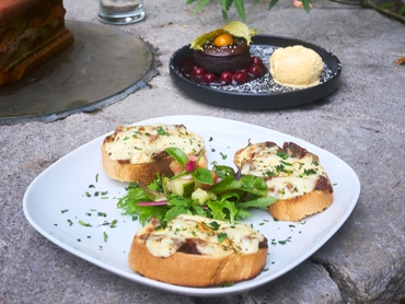 geröstetes Baguette mit Pesto-Butter, getrockneten Tomaten und gratiniertem Mozzarella