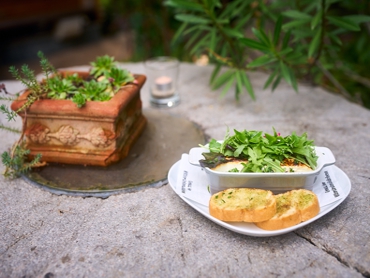 auf marinierten Tomaten mit Knoblauch, Zwiebeln, Petersilie und Balsamico